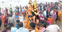 C T Online Desk: Oct 2, 2025 – The five-day Durga Puja, the biggest religious festival of the Hindu community, concluded today in Chattogram with the immersion of Goddess Durga’s idols at Patenga and Khalurghat beaches amid festivity and tight security.