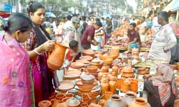 The fair offers clay utensils, bamboo and cane furniture, wooden items, toys, vases, dolls, fishing gear, baskets, hand fans, saplings, sweets, and various household goods.